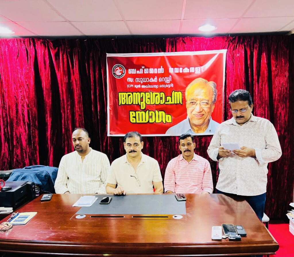 ബഹ്റൈൻ : സിപിഐ മുൻ ജനറൽ സെക്രട്ടറി യും മുൻ പാർലമെന്റെ റിയാനുമായ സുധാകർ റെഡ്ഢി യുടെ നിര്യണം ഇടതുപക്ഷ പുരോഗമന രാഷ്ട്രീയത്തിന് തീരാ നഷ്ടമാണെന്ന് അനുശോചന പ്രമേയത്തിൽ പറഞ്ഞു. അനുശോചന പ്രമേയം ശ്രീജിത്ത് ആവള അവതരിപ്പിച്ചു വിദ്യാർത്ഥി കളുടെ അവകാശ സമര പോരാട്ടങ്ങളിൽ തുടങ്ങി ജീവിതം പാവപ്പെട്ടവർക്കും അരികു വത്കരിക്ക പെടുന്നവർക്കും വേണ്ടി മാറ്റിവച്ച ധീരനായ പോരാളിയായിരുന്നു സുധാകർ റെഡ്ഢിയെന്ന് കോഓർഡിനേഷൻ സെക്രട്ടറി ജേക്കബ് മാത്യു അനുസ്മരിച്ചു .ലോക കേരള സഭ അംഗം ഷാജി മൂതല ,എസ്സ് വി ബഷീർ ബിജു മലയിൽ, അസീസ് ഏഴകുളം,രാജ് കൃഷ്ണൻ ,ഷാജഹാൻ എം കെ ,മനോജ് മഞ്ഞക്കാല എന്നിവർ സംസാരിച്ചു പ്രശാന്ത് മാ ണിയത്തു സ്വാഗതവും സുനിൽദാസ് അധ്യക്ഷവും വഹിച്ചു.