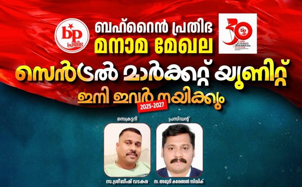 മനാമ: ബഹ്റൈൻ പ്രതിഭയുടെ മനാമ മേഖല സെൻട്രൽ മാർക്കറ്റ് യൂണിറ്റ് സമ്മേളനം 19/09/2025 ൽ സ: വിനോദ് വി നഗറിൽ (MCMA) വെച്ച് നടന്നു.സ: ഷാലറ്റ് മനോജ് പോൾ സ്വാഗത ഗാനം ആലപിച്ചു തുടങ്ങിയ ചടങ്ങിൽ, സ: അമുദി സിദ്ദിഖ് സ്വാഗതവും, സ: പ്രതീപൻ അധ്യക്ഷത വഹിക്കുകയും ചെയ്തു.സ: സുലേഷ് വി കെ ഉത്ഘാടനം നിർവഹിച്ച ചടങ്ങിൽ, സ: സൗമ്യ പ്രതീപ് അനുശോചന പ്രമേയവും, സ: ശ്രീജിഷ് വടകര രക്തസാക്ഷി പ്രമേയവും അവതരിപ്പിച്ചു.യൂണിറ്റ് സെക്രട്ടറി സ: നൂബിൻ അൻസാരി കഴിഞ്ഞ 2 വർഷത്തെ യൂണിറ്റ് പ്രവർത്തന റിപ്പോർട്ട് അവതരിപ്പിക്കുകയും, മേഖല കമ്മറ്റി അംഗം സ: സുരേഷ് വയനാട് സംഘടനാ റിപ്പോർട്ട് അവതരിപ്പിക്കുകയും. തുടർന്നു രക്ഷാധികാരി സമതി അംഗം സ: സുബൈർ കണ്ണൂർ, സെൻട്രൽ മാർക്കറ്റ് രക്ഷാധികാരി സ: നജീബ് മീരാൻ, കേന്ദ്ര മെംബർഷിപ്പ് സെക്രട്ടറി സ: അനീഷ് കരിവള്ളൂർ എന്നിവർ സമ്മേളനത്തെ അഭിവാദ്യം ചെയ്ത് സംസാരിക്കുകയും ചെയ്തു. നിലവിലെ യൂണിറ്റ് സെക്രട്ടറി 2025 – 2027 വർഷ കാലത്തെ പുതിയ എക്സിക്യൂട്ടീവ് കമ്മറ്റി പാനൽ അവതരിപ്പിക്കുകയും സമ്മേളനം അംഗീകരിക്കുകയും ചെയ്തു, പുതിയ എക്സിക്യൂട്ടീവ് അംഗങ്ങൾ ചേർന്ന ആദ്യ മീറ്റിങ്ങിൽ തിരഞ്ഞെടുത്ത ഭാരവാഹികളെ മേഖല കമ്മറ്റി അംഗം സ: ജീവൻ കല്ലറ സമ്മേളന സദസിനെ അറിയിച്ചു.സ: ശ്രീജീഷ് വടകര യൂണിറ്റ് സെക്രട്ടറിയും, സ: അമുദി സിദ്ധിക് യൂണിറ്റ് പ്രസിഡന്റും, സ: ഷമീർ ചല്ലിശ്ശേരി മെംബർഷിപ്പ് സെക്രട്ടറിയും, സ: റമീസ് (വൈസ് പ്രസിഡന്റ്) സ: ഷാഹിർ ഷാജഹാൻ ( ജോയിന്റ് സെക്രട്ടറി) സ: സൈനൽ കൊയിലാണ്ടി (അസിസ്റ്റന്റ് മെംബർഷിപ്പ് സെക്രട്ടറി ) മറ്റു എക്സിക്യൂട്ടീവ് അംഗങ്ങൾ സ: രതീഷ് ചെറുകുന്ന്, സ: അക്ബർ, സ: ആഷിക്ക് റഹ്മാൻ, സ: ഷറീജ്, സ: സൗമ്യ പ്രതീപ്, സ: സമീറ അമുദി, സ: ജെസിയ. ജെ, സ: നൂബിൻ അൻസാരി (ക്ഷണിതാവ്) എന്നിങ്ങനെ സമ്മേളനം തിരഞ്ഞെടുത്തു.പുതുതായി ചുമതലയേറ്റ യൂണിറ്റ് സെക്രട്ടറി സ: ശ്രീജിഷ് വടകര സമ്മേളനത്തെ അഭിസംബോധന ചെയ്തു സംസാരിച്ചു. തുടർന്ന് മേഖല സമ്മേളന പ്രതിനിധികളെ പ്രഖ്യാപിച്ചു. 61 മെമ്പർമാരും 11 അസ്സോസിയേറ്റ് മെമ്പർമാരും ഉൾപ്പടെ 72 പേർ സമ്മേളനത്തിൽ പങ്കെടുത്തു.