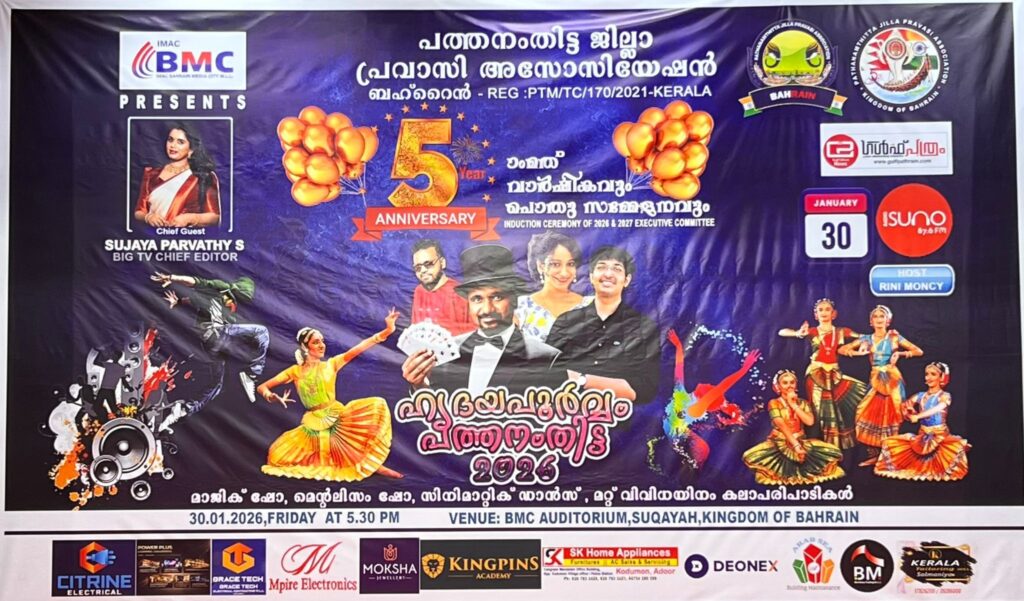 ,സിജി തോമസ് -ജോയിന്റ് സെക്രട്ടറി ,അനിൽ കുമാർ – ജോയിറ്റ് ട്രഷറർ , അനിൽ രാഘവൻ – പ്രോഗ്രാം കൺവീനർ , ദയ ശ്യാം – ലേഡീസ് വിങ് പ്രസിഡന്റ് , ലിബി ജെയ്സൺ ലേഡീസ് വിങ് സെക്രട്ടറി മറ്റ് എക്സക്യൂട്ടിവ് അംഗങ്ങളായ ഷീലു വർഗീസ് , സുഭാഷ് തോമസ് ,ബിജിൻ ശ്രീകുമാർ , ശ്യാം s പിള്ള, ജെയ്സൺ , ബിബിൻ മടത്തേത് അഞ്ചു വിഷ്ണു , ലയ അനിൽ , സിൻസി തോമസ് . ലേഡീസ് വിങ് സബ് കമ്മറ്റി ഭാരവാഹിയായ സൂര്യ വിനീത് എന്നിവരും വിമാനത്താവളത്തിൽ സുജയ പാർവതിയെ സ്വീകരിക്കാൻ എത്തിയിരുന്നു . പത്തനംതിട്ട ജില്ലാ പ്രവാസി അസോസിയേഷൻ ബഹ്റൈൻ്റെ അഞ്ചാമത് വാർഷികവും 2026 -27 വർഷത്തെ കമ്മിറ്റിയുടെ സ്ഥാനാരോഹണവും ഹൃദയപൂർവ്വം പത്തനംതിട്ട എന്ന പേരിൽ ജനുവരി മാസം മുപ്പതാം തീയതി വെള്ളിയാഴ്ച വൈകിട്ട് ആറുമണി മുതൽ സെഗയ ഐ മാക് ബിഎംസി ഹാളിൽ വച്ച് നടക്കും . മാജിക് ഷോ,മെന്റലിസം ഡാൻസ്,പാട്ട് തുടങ്ങി വിവിധ കലാപരിപാടികളും ഇതോടൊപ്പം നടക്കും .