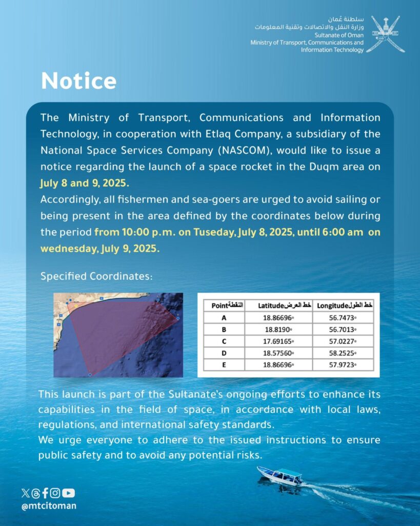 ഒമാൻ : ബഹിരാകാശ മേഖലയിൽ ചരിത്രപരമായ മറ്റൊരു കുതിപ്പിനൊരുങ്ങി ഒമാൻ.. ജൂലൈ 8 നു വൈകീട്ട് 10 മുതൽ 9 നു രാവിലെ ആറുവരെയാണ് വിക്ഷേപണം ഷെഡ്യൂൾ ചെയ്തിട്ടുള്ളത്.. അതിനാലാണ് 8, 9 തീയതികളിൽ അൽ വുസ്ത തീരത്ത് സമുദ്ര പ്രവർത്തനങ്ങൾക്ക് താൽക്കാലിക നിയന്ത്രണങ്ങൾ ഏർപ്പെടുത്തിയിട്ടുള്ളത് … അൽ ജാസിർ വിലായത്തിലെ അൽ കഹൽ പ്രദേശത്തും ദുകം വിലായത്തിലെ ഹിതം പ്രദേശത്തുനിന്നുമായിരിക്കും പരീക്ഷണ വിക്ഷേപണം. സ്റ്റെല്ലാർ കൈനറ്റിക്സുമായി സഹകരിച്ചാണ് വിക്ഷേപണം നടത്തുന്നത്. ഒമാനിലെ ബഹിരാകാശ പ്രവർത്തനങ്ങൾക്കായി ഒരു ദേശീയ ചട്ടക്കൂട് സ്ഥാപിക്കുന്നതിനുള്ള തുടർച്ചയായ ശ്രമങ്ങളുടെ ഭാഗമാണ് വിക്ഷേപണമെന്ന് അധികൃതർ അറിയിച്ചു. റോക്കറ്റ് പരീക്ഷണ വിക്ഷേപണത്തിന് തയാറെടുക്കുന്നതിനാൽ അൽ വുസ്ത തീരത്ത് സമുദ്ര പ്രവർത്തനങ്ങൾക്ക് താൽക്കാലിക നിയന്ത്രണങ്ങൾ ഏർപ്പെടുത്തിയതായി കൃഷി, മത്സ്യബന്ധനം, ജലവിഭവ മന്ത്രാലയം അറിയിച്ചു. മത്സ്യത്തൊഴിലാളികളോടും കടൽ യാത്രക്കാരോടും എല്ലാ സുരക്ഷാ നിർദേശങ്ങളും പാലിക്കാനും വിക്ഷേപണ സമയത്ത് നിയുക്ത പ്രദേശം ഒഴിവാക്കാനും ആവശ്യപ്പെട്ടു. ഈ വർഷം അഞ്ച് റോക്കറ്റുകൾ വിക്ഷേപിക്കുമെന്ന് ഇത്തലാഖ് സ്പേസ്പോർട്ട് അറിയിച്ചിരുന്നു. കഴിഞ്ഞ വർഷം ഡിസംബറിൽ നടത്തിയ ആദ്യത്തെ പരീക്ഷണ വിക്ഷേപണം വിജയം കണ്ടതോടെ ചരിത്രനേട്ടമാണ് സ്പേസ്പോർട്ട് സ്വന്തമാക്കിയത്. അന്ന് സമുദ്രനിരപ്പിൽനിന്ന് 140 കിലോമീറ്റർ ഉയരത്തിലായിരുന്നു റോക്കറ്റ് പറന്നുയർന്നത്. 2027 ഓടെ പൂർണ തോതിലുള്ള വാണിജ്യ പ്രവർത്തനങ്ങൾക്ക് ശക്തമായ അടിത്തറ സ്ഥാപിക്കുക എന്ന ലക്ഷ്യത്തേടെ ഇത്തലാക്കിന്റെ ‘ജെനസിസ് പ്രോഗ്രാ’മിലൂടെ ഒമാൻ ലക്ഷ്യമിടുന്നത്.