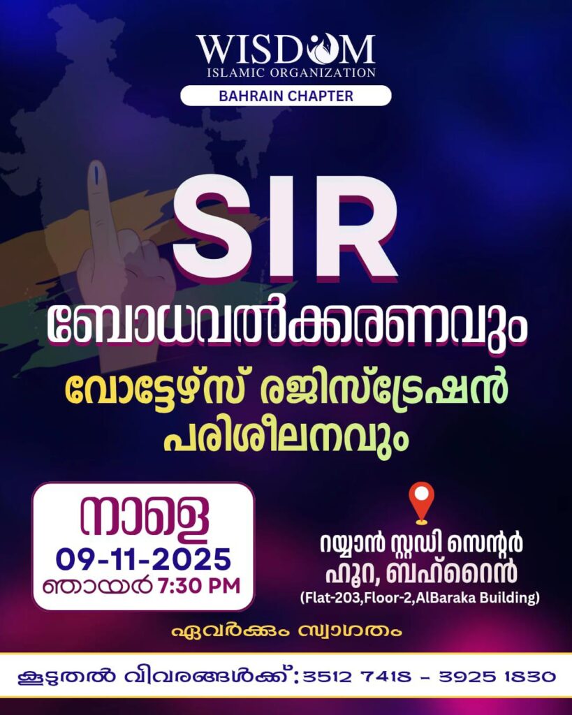 മനാമ : വിസ്ഡം ഇസ്ലാമിക് ഓർഗനൈസെഷൻ ബഹ്റൈൻ ചാപ്റ്റർ സംഘടിപ്പിക്കുന്ന SIR ബോധവൽക്കരണവും വോട്ടേഴ്സ് രെജിസ്ട്രേഷൻ പരിശീലനവും ഇന്ന് (09/11/2025 ഞായർ) രാത്രി 7:30 റയ്യാൻ സ്റ്റഡി സെന്ററിൽ വെച്ച് നടക്കുമെന്ന് ഭാരവാഹികൾ അറിയിച്ചു. പ്രസ്തുത വിഷയത്തേക്കുറിച്ചു അറിയാനാഗ്രഹിക്കുന്ന എല്ലാവരും ബോധവൽക്കരണ പരിപാടിയിൽ പങ്കെടുക്കണമെന്നും അറിയിപ്പിൽ പറഞ്ഞുവിശദവിവരങ്ങൾക്ക് 3512 7418, 39251830 എന്നീ നമ്പറുകളിൽ ബന്ധപ്പെടാവുന്നതാണ്